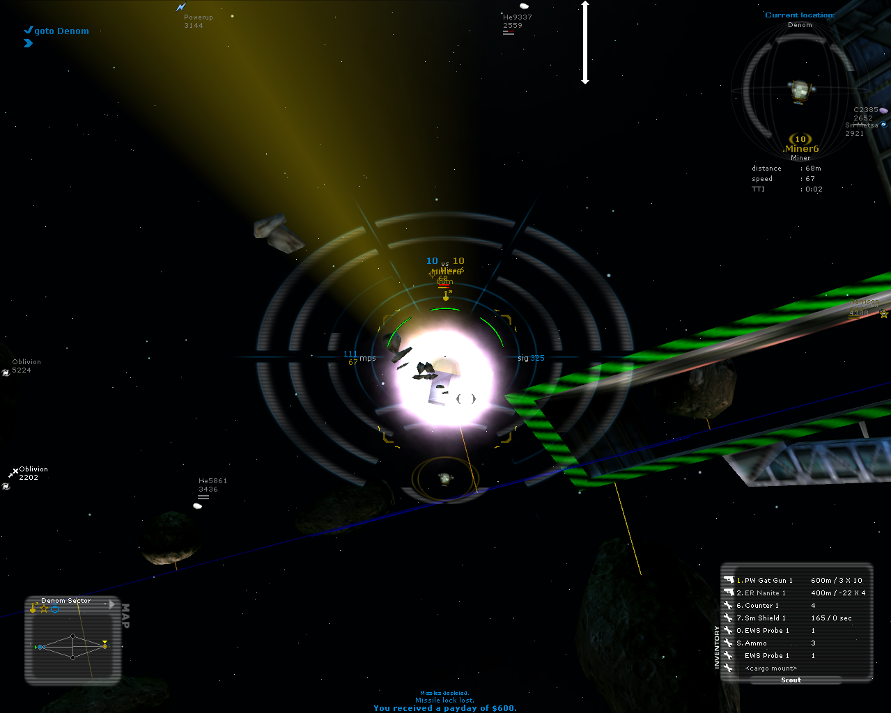 Blue team, eyed with yellow target with depleted shield and damaged hull.